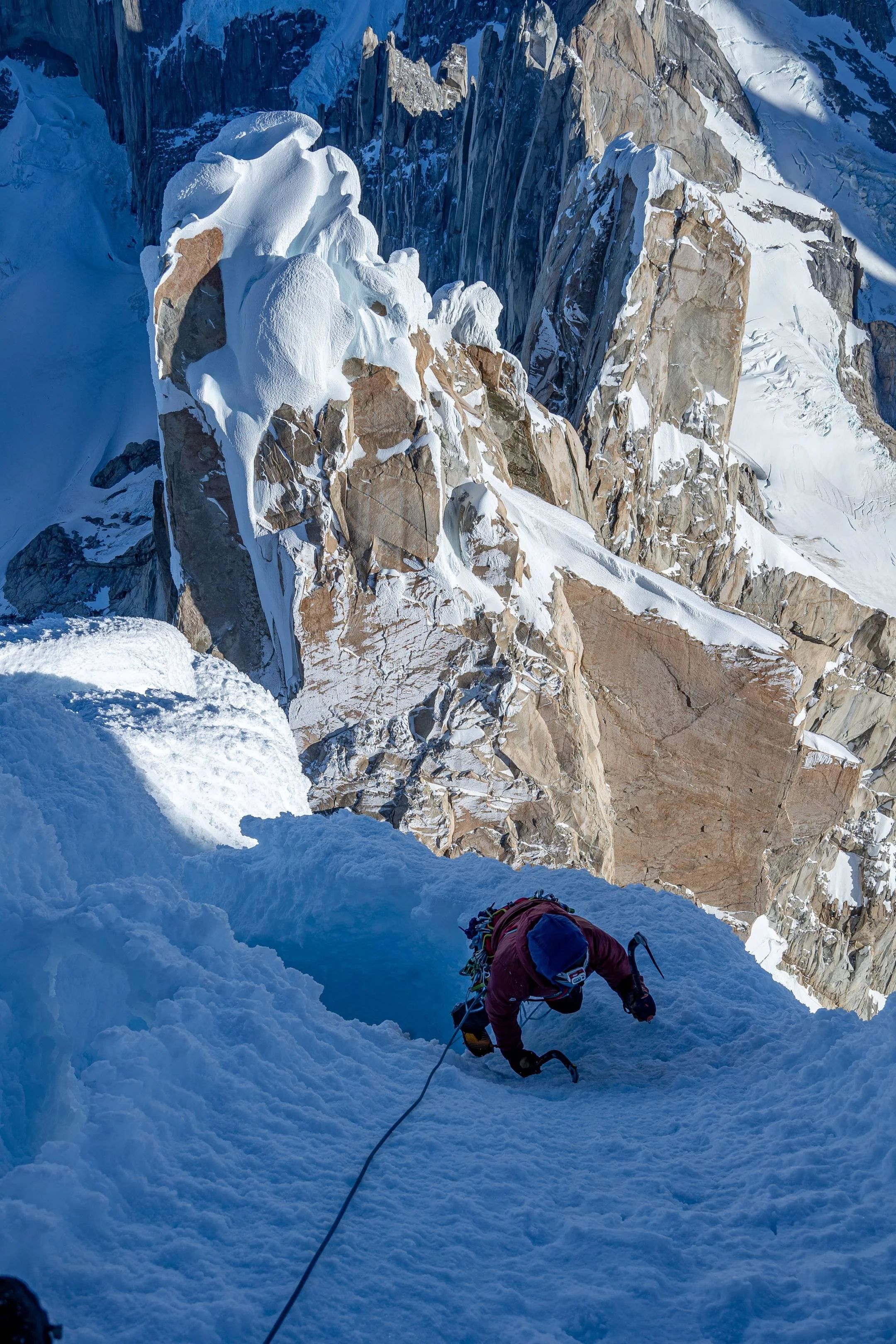 Das anhaltende Scheißwetter hat den ganzen Fels mit einer ordentlichen Portion Schnee und Eis verziert, in Kombination mit den -10 °C macht das jegliche Felskletterei ziemlich unangenehm. Zum Glück gibt’s da drunten aber nicht nur Felsrouten, sondern auch ziemlich einmalige Klettereien im Eis. Dafür wären die Verhältnisse perfekt, da war ich mir sicher… Allen Routen voran: Die „Ragni-Route“ auf den Cerro Torre.