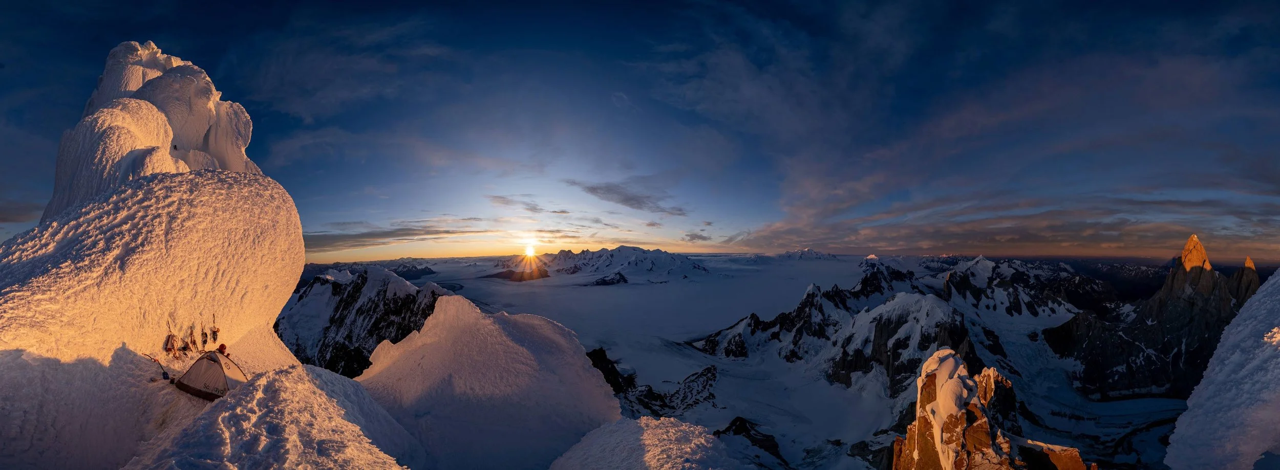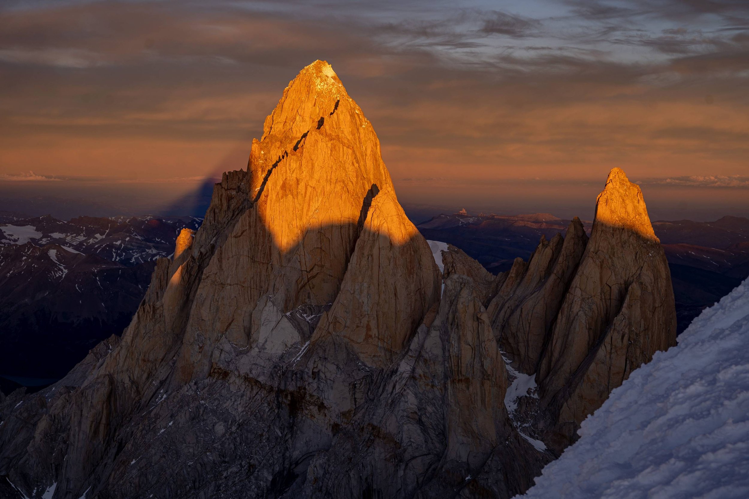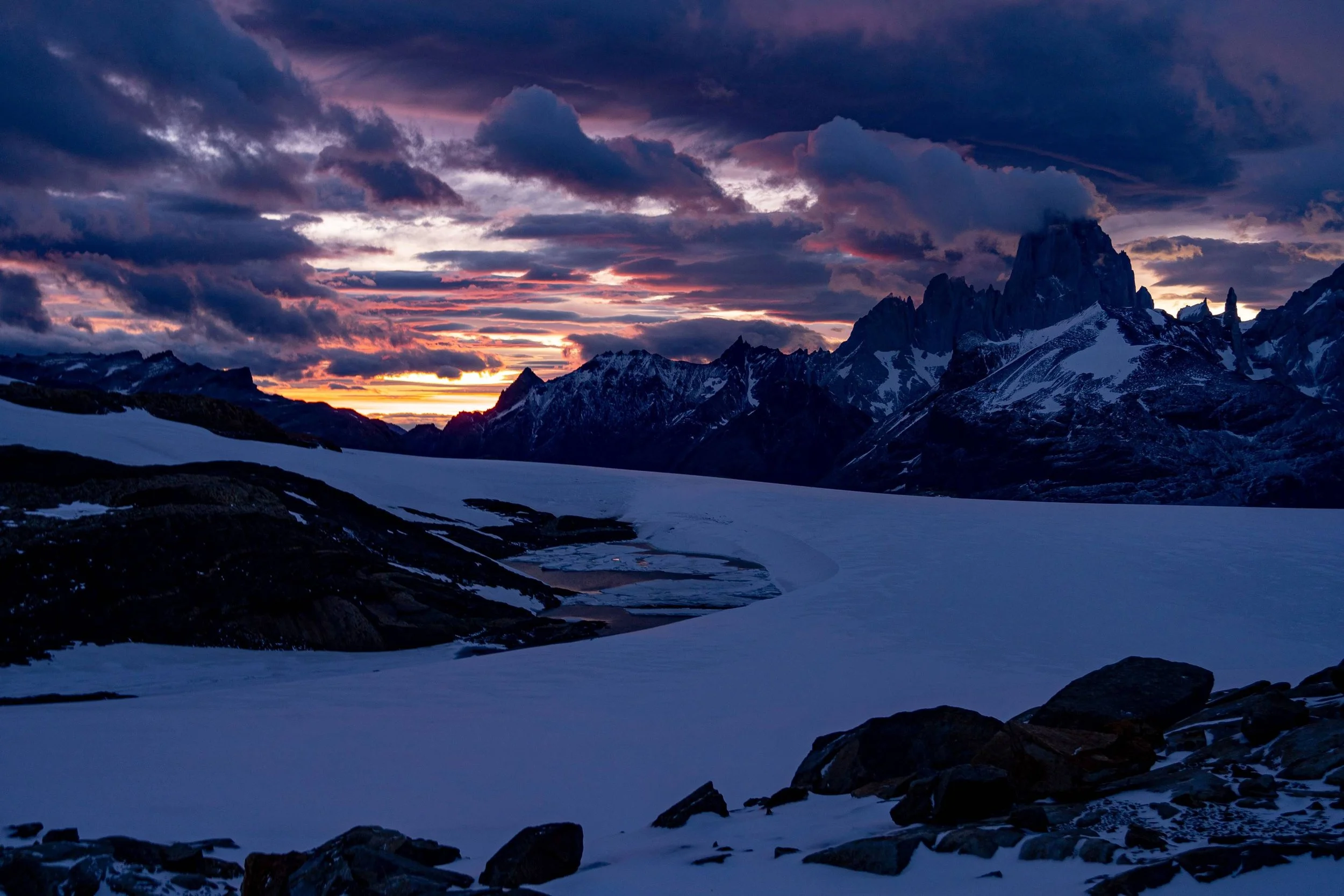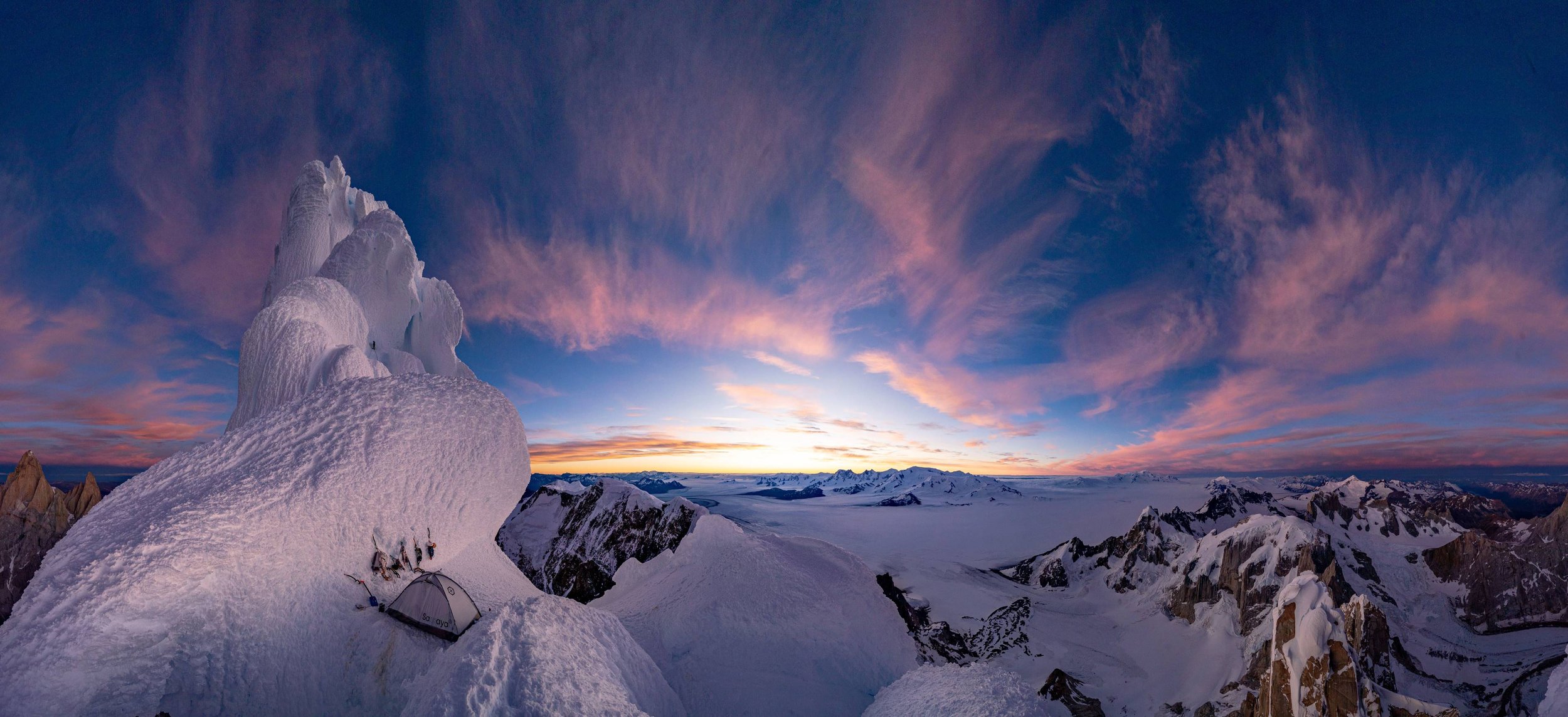 Gedauert hat das Schauspiel wohl etwas mehr als 2 Stunden, zumindest ist es schon spät Abends, als wir glücklich aber todmüde einen geeigneten Biwakplatz finden. Und was für einen. Auf der einen Seite die ewige Weite des Inlandeises, auf der anderen Seite bauen sich die 3 Gipfeleispilze des Cerro Torre vor uns auf. Das letzte Abendlicht projiziert surreale Farben in den Himmel und lässt den Fitz Roy und die Poincenot in schon fast kitschigen Orange- und Rottönen erstrahlen. Diese beiden Felsgipfel sind neben dem Cerro Torre die höchsten in dem ganzen Gebiet.