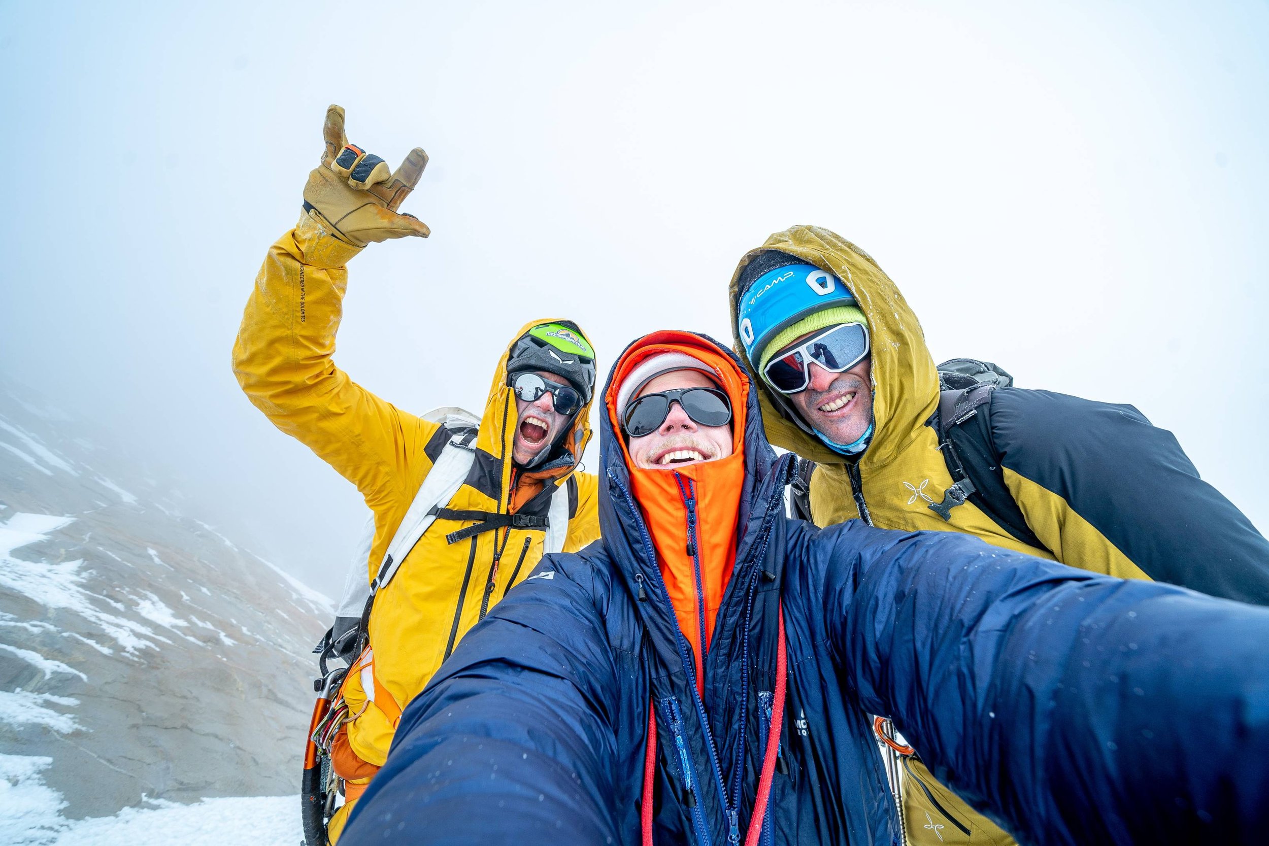 Kurz bevor ich loslege, bekomme ich von einem hechelnden Amerikaner eine Lawinenschaufel und ein „Good Luck“ zugesteckt. Er hats geschafft die komplette Strecke bis ins Biwak mit Fixseilen zu versehen und mit Schaufel und einer Steigklemme zu uns zu kommen. In unter einer Stunde. Das bringt auch den Vorteil mit sich, schnell wieder nach unten zu kommen, für den Fall dass das Schlechtwetter hereinzieht. Bestens ausgerüstet mache ich mich an die Arbeit und komme so um einiges schneller voran als meine Vorgänger. Komplett durchnässt und durchgefroren steche ich Block für Block aus dem Berg und lasse sie voller Spaß in die Tiefe rauschen. Ein abgefahrenes Szenario. Nach einiger Zeit verhärtet sich der Schnee und ein natürlicher Eisüberhang drängt meine Tunnelpläne etwas ab. Bald schon sehe ich das Sonnenlicht blau durch den sonst bereits dunklen Tunnel schimmern, und mit letzter Kraft grabe ich mich an die Oberfläche. Ähnlich eines Maulwurfs. Bloß in der Vertikalen, und komplett durchnässt. Großes Jubeln. Aber über mir sind‘s immer noch 10m verfestigter Schnee, ehe das Eis durchschimmert. Zu meinem großen Glück sehe ich, wie sich Claudio schon hochmotiviert mit Eisgeräten ausrüstet und mich ablöst. Selten habe ich’s erlebt, dass so viele unterschiedliche Seilschaften so reibungslos zusammenarbeiten, um ihr gemeinsames Ziel zu erreichen. Keiner muss der Erste sein, alle schauen aufeinander und die Stimmung ähnelt eher einem Sportklettergarten, wo man sich gegenseitig anfeuert. Bloß mit 1000m Luft unterm Arsch. Und bei -10°C. Claudio macht seinen Job hervorragend und hat die Schwierigkeiten schon bald hinter sich. Leo und ich fixieren von ihm gesichert die Seile, damit der Rest der Truppe aufsteigen kann. Gipfel gegen 14Uhr. Eigentlich wollte wir spätestens um 12 Uhr umkehren. Schön langsam wird’s aber höchste Zeit. Trotzdem genießt jeder den Moment, schaut in die Ferne des Inlandeises und bewundert die gegenüberliegenden Felstürme. Absolute Freude durchdringt mich, schon lange nicht mehr wurde mein Körper so stark mit Endorphinen durchspült.